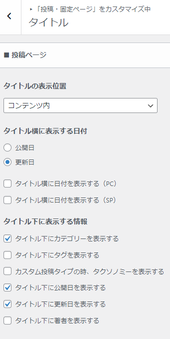 外観・カスタマイズ>「カスタマイザー」→「投稿・固定ページ」→